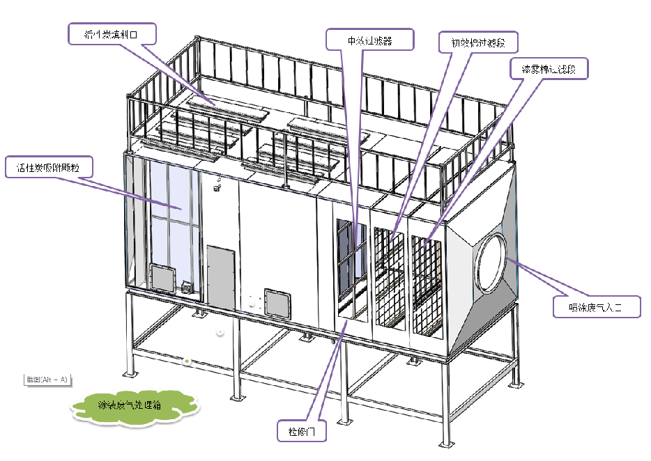 本公司设计、生产的活性炭涂装废气处理箱,是我司喷涂工作站中废气处理的重要部件(单元),活性炭吸附箱具有吸附效率高、适用面广、维护方便、能同时处理多种混合废气等优点。