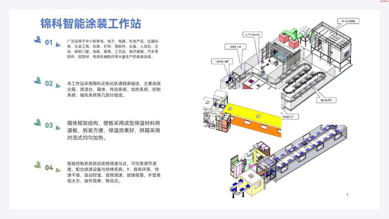 jinker是一家非标工业自动化和工业云系统平台的方案集成解决商,深耕涂装自动化、环境自动化和智能系统数字化三大领域,针对行业群体推出“硬件总装、软件集成、技术设计、施工总包”服务,让客户获得一站式行业服务,高质量又高效益。