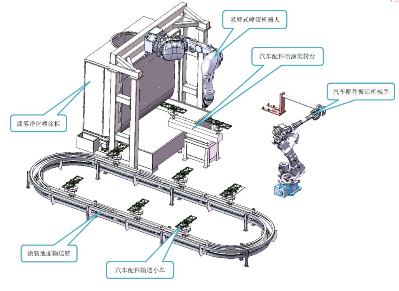 painting automation technology not only improves efficiency and stabilizes quality, but also has the value of eliminating pollution, improving paint utilization, and achieving energy conservation and environmental protection when using automatic spraying in painting workshops. The core of the development of painting technology is to develop towards efficient and compact processes such as simplifying and merging processes. The pollution-free additive manufacturing method will become the main driving force for promoting the intelligent top-level overall design of painting. Improving the quality of robot spraying car bodies and leveraging the flexibility of robot spraying has become a key issue in the automotive manufacturing coating workshop. Jinke Green Technology Co., Ltd. can take into account the requirements of robot spraying flexibility and high quality in the design and planning stage of new or renovated factories, and improve the quality of robot spraying and production flexibility from the source< Br/>