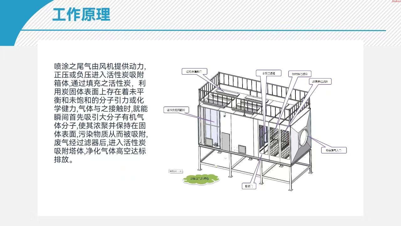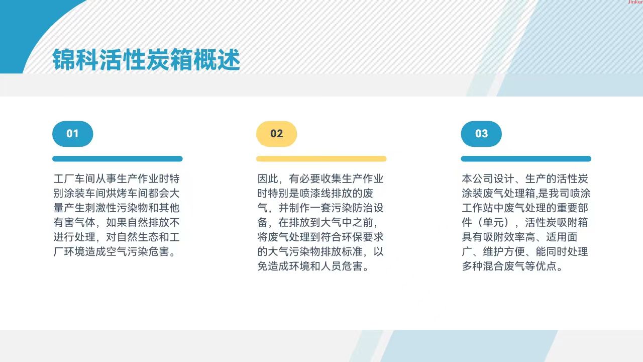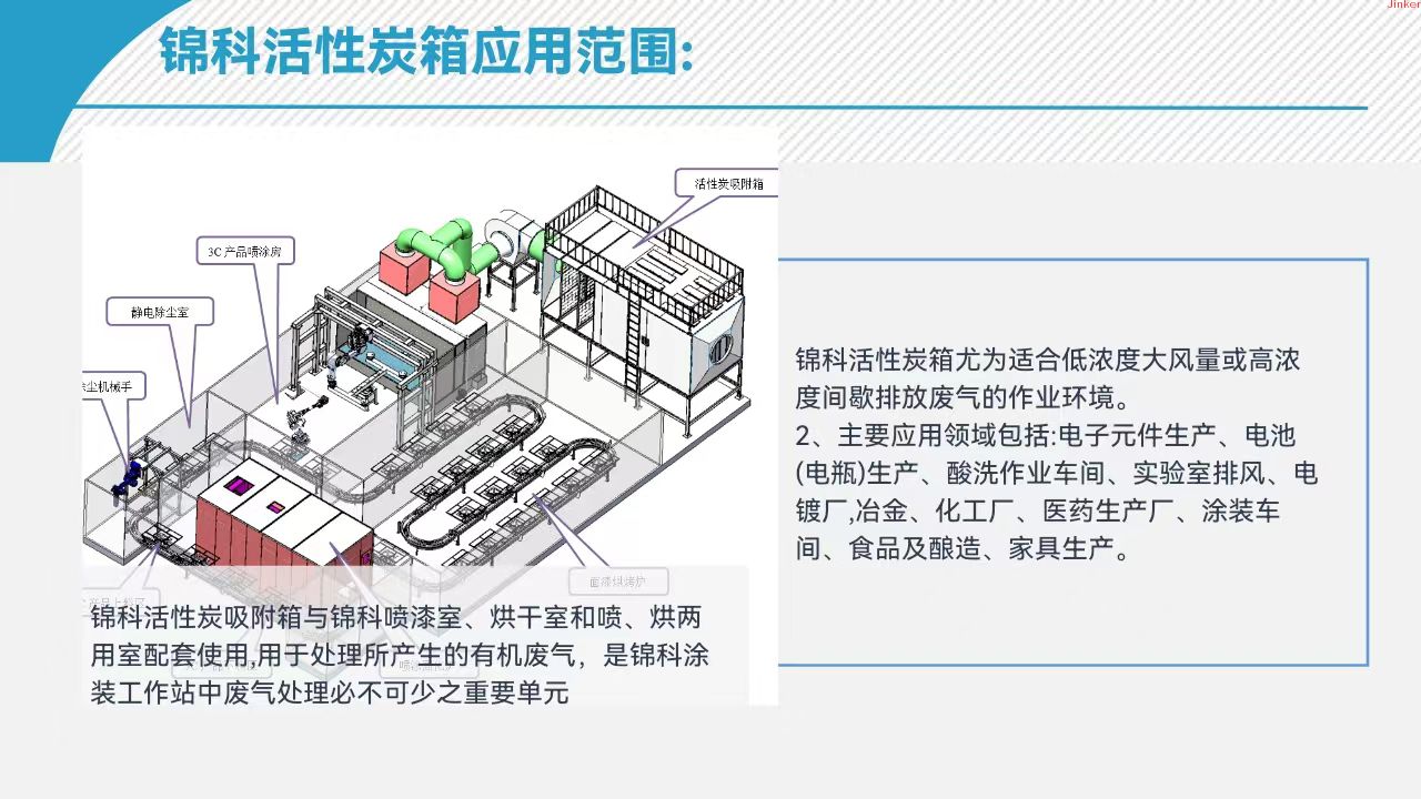 Jinke activated carbon box is particularly suitable for working environments with low concentration, high air volume, or high concentration intermittent exhaust emissions. 2. The main application areas include: electronic component production, battery (battery) production, pickling workshop, laboratory exhaust, electroplating factory, metallurgy, chemical factory, pharmaceutical production factory, coating workshop, food and brewing, furniture production.
